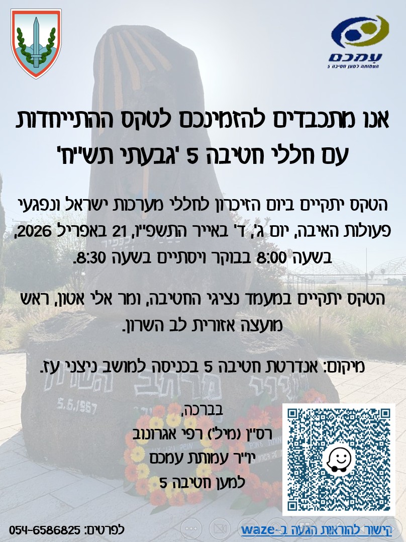אנו מתכבדים להזמינכם לטקס יום הזיכרון עם חללי חטיבה 5 'גבעתי תש"ח'.